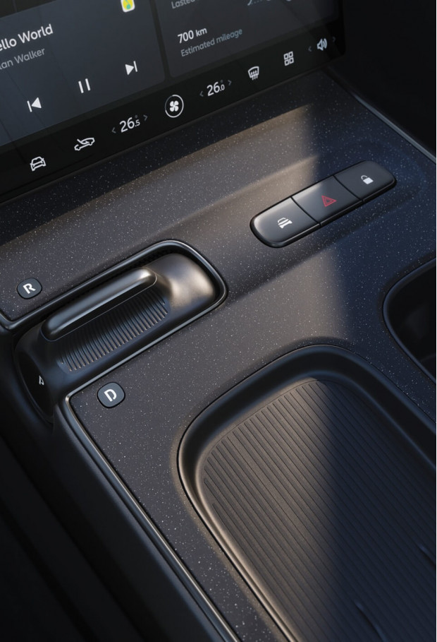 Предложен только один уровень оснащения, который включает панорамную крышу и обивку сидений, сделанную с применением вторсырья. Перед водителем установлен приборный дисплей на 10,2 дюйма, AMOLED-экран медиасистемы — диагональю 12,8 дюйма, а над ним установлен анимированный «покемон», который олицетворяет голосового помощника. А вместо проекционного экрана предложены очки дополненной реальности, которые разработаны совместно с компанией Nreal. Дефлекторы системы вентиляции замаскированы, как и у Теслы, за переключение режимов трансмиссии отвечает миниатюрный качающийся переключатель на центральном тоннеле.