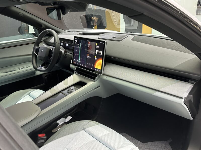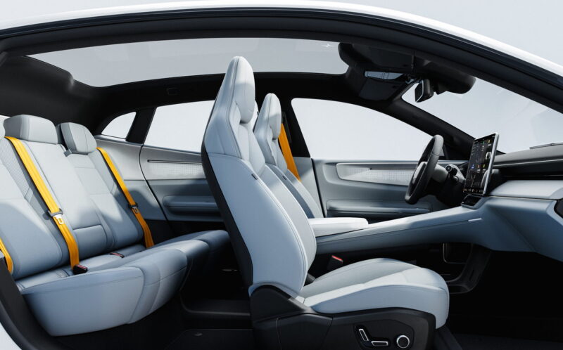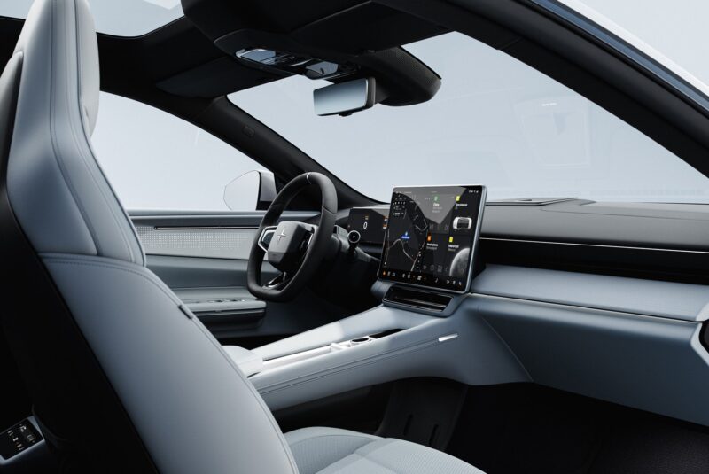 Салон, как и у других моделей Polestar, оформлен в духе минимализма. На передней панели — приборный экран (10,2 дюйма), тачскрин медиасистемы (15,4 дюйма) и проекционный дисплей (14,7 дюйма), а физических кнопок почти нет. Зато есть… салонное зеркало заднего вида. Невзирая на отсутствие заднего стекла, это именно зеркало со встроенным экраном, на который передается картинка с задней камеры на крыше. Видеотрансляцию можно отключить, и тогда через зеркало можно, например, наблюдать за детьми на заднем сиденье.