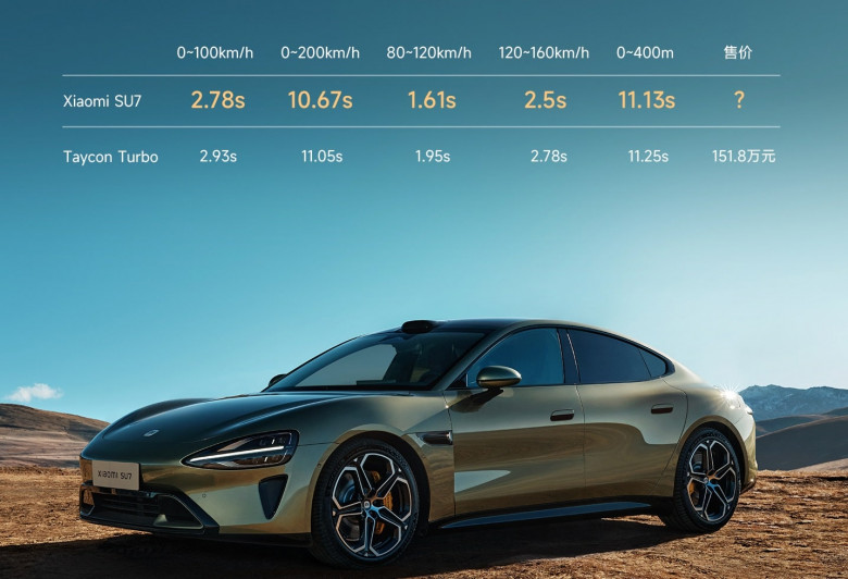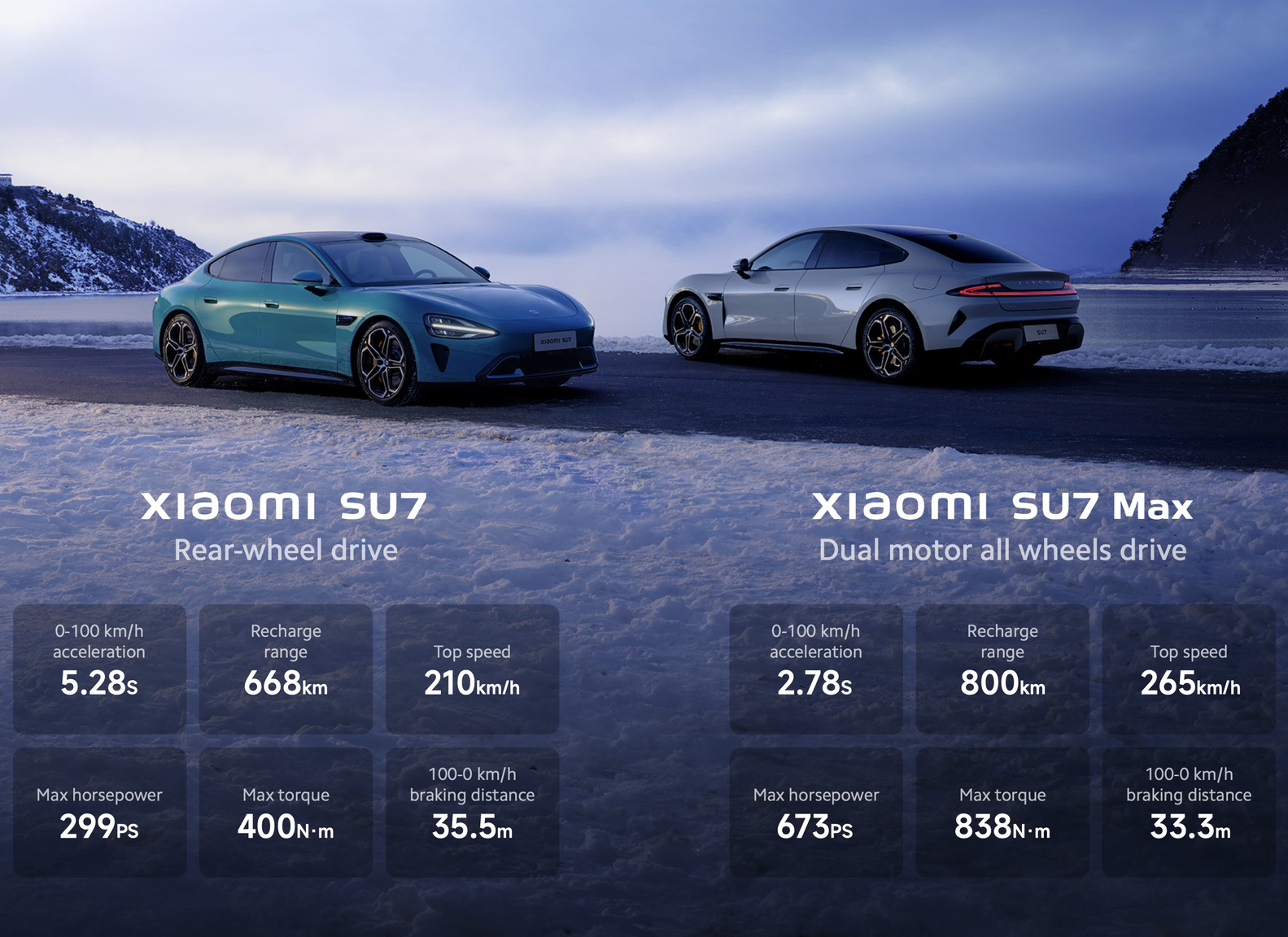 ● Xiaomi SU7. Базовая комплектация с задним приводом и запасом хода до 668 км. Разгоняется от 0 до 100 км/ч за 5,28 секунды, а тормозит за 35,5 м. Развивает максимальную скорость до 210 км/ч. Максимальная мощность этой версии авто — 299 л.с.