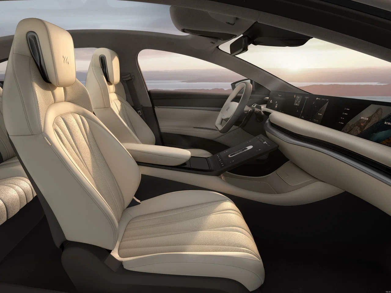 В электромобиле Zhiji L7 установлен 39-дюймовый экран который проходит слева и справа, а под центральным управлением находится 12,8-дюймовый сенсорный экран.